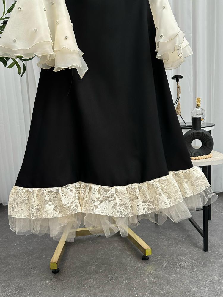 خامة القماش/كريب باربي +اكمام جازارا+اطراف من الدانتيل