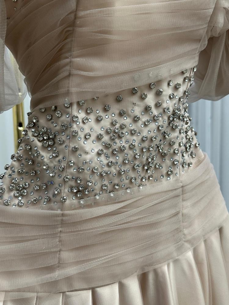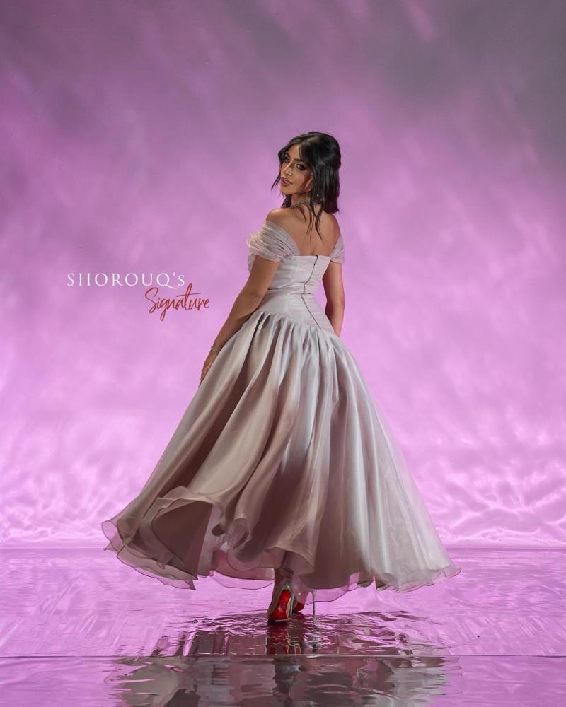 • القَصّة: الفستان منفوش (Ball gown style) بخصر ضيق وتنورة واسعة جدًا تمتد وتتحرك بانسيابية، مما يضفي عليه طابعًا دراميًا وأناقة ملكية.