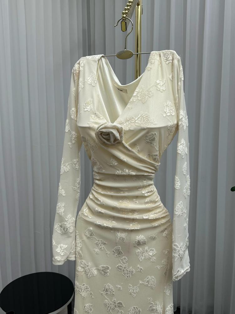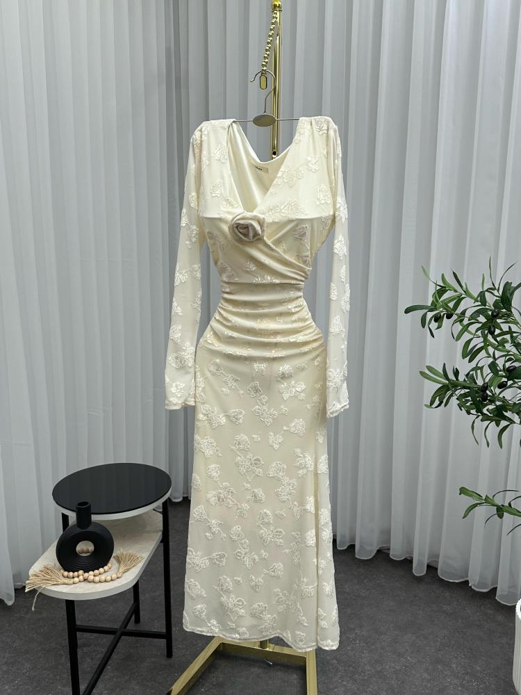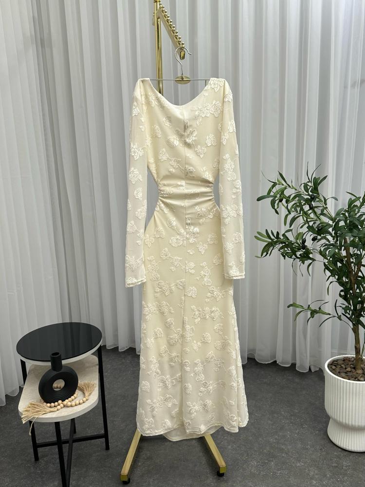 الفستان يتميز بتصميم أنيق وراقي بلون أوف وايت (أبيض مائل للسكري)، مما يمنحه لمسة فخامة ونعومة تناسب المناسبات الخاصة.